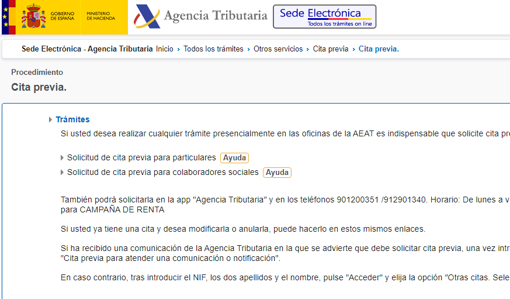 Puedes solicitar cita previa en la agencia tributaria llamando al nmero 901 200 351. Solicitud de cita previa para colaboradores sociales Ayuda Tambin podr solicitarla en la app Agencia Tributaria y en los telfonos 901200351 912901340. Se trata con ello de evitar aglomeraciones y esperas garantizando la calidad comodidad y seguridad en la atencin al ciudadano.